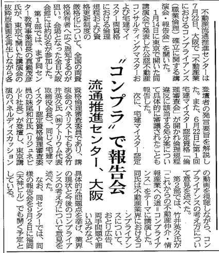 住宅新報 2020年8月4・11日号 5面に、大阪のコンプライアンス講演会 報告会の記事が掲載されました。
