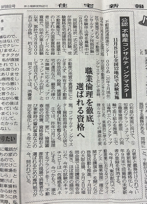 Topics:新聞記事掲載のお知らせ住宅新報 2020年9月8日号に、福岡のコンプライアンス講演会 報告会終了後に公認 不動産コンサルティングマスターの記事が掲載されました。